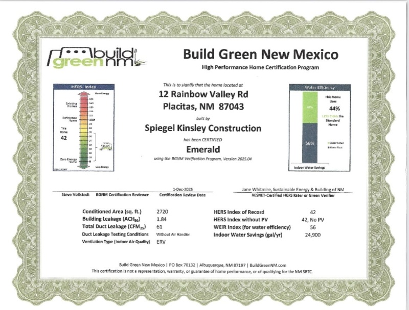 This project proudly earned Build Green New Mexico – Emerald Certification, the highest level available, comparable to LEED Platinum. Highlights include: